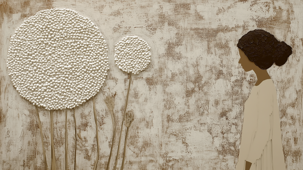 “Cotton Girl” by Alexa Wagner is a contemplative piece that blends nature and history. The textured, cotton-like forms evoke both natural beauty and the weight of the past, subtly referencing the history of cotton production and its dark sides. Through neutral tones and delicate forms, Alexa Wagner invites reflection on innocence, resilience, and the complexities of history, making this artwork both visually and symbolically profound..
